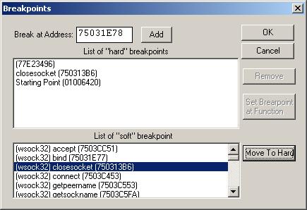 SocketSpy permints to set hard breakpoint to stop execution of debugged process and watch